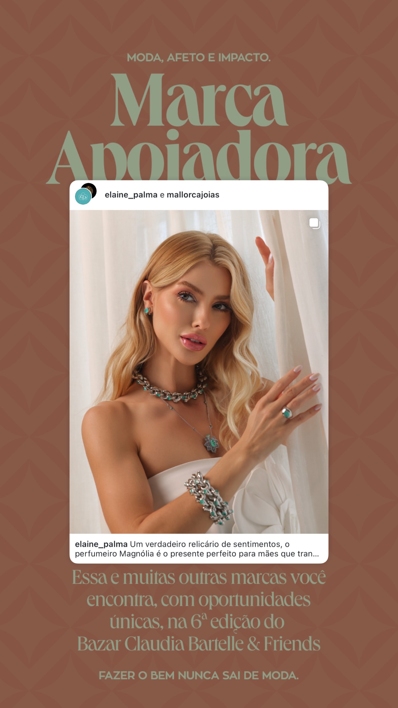 Quem visitar o bazar terá a oportunidade de adquirir acessórios e joias Elaine Palma com preços diferenciados – uma chance única de levar para casa peças autorais e ao mesmo tempo contribuir para transformar vidas.